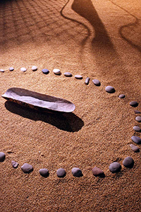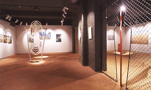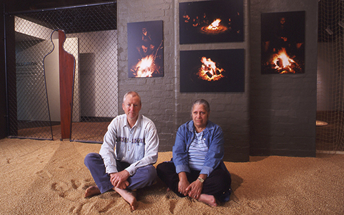 A soundscape of clapsticks, interspersed with wailing for the old ones, the loss of country and continuing dispossession, was part of the exhibition. One side of the exhibition space floor was covered in red sand, the other side in wheat. Visitors were encouraged to walk barefoot.