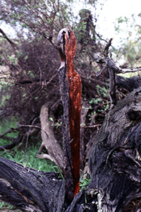 The vineyard expansion grows out of old resources that cannot be replaced in the short term, cycles of renewal are broken, life’s fluids sucked upon. Palimpsest patterns overlay the old, the familiar fades, some of our old landscape friends disappear. The ancient River Red Gum (Eucalyptus camaldulensis) from which this slab is cut was felled for vineyard expansion in the Langhorne Creek district.